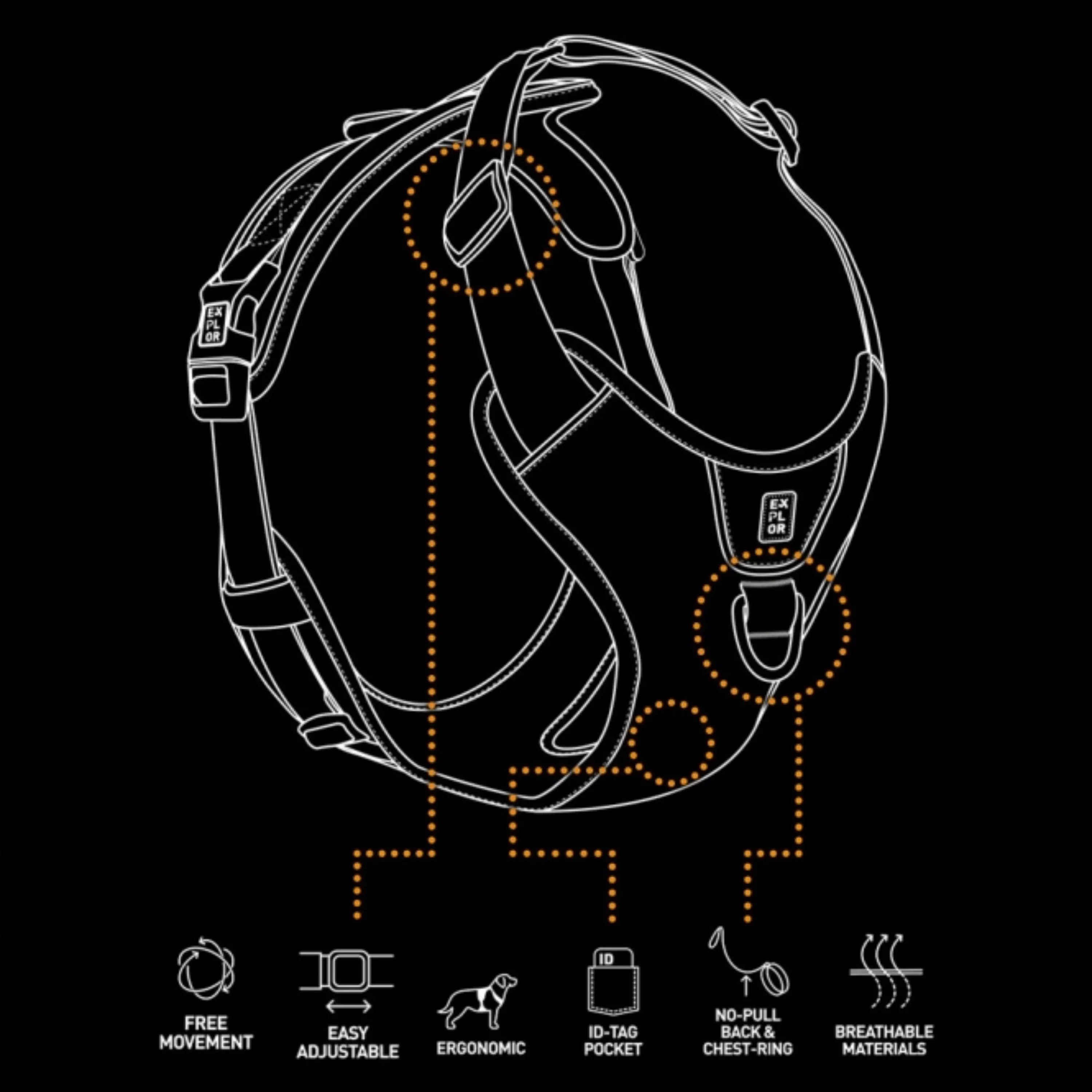 Mit dem Duvoplus EXPLOR Ultimate Fit No Pull Geschirr gehst du entspannt spazieren, weil der Druck beim Ziehen gleichmäßig über die Brust verteilt wird und der Nacken geschont bleibt, dein Hund hat dabei viel Bewegungsfreiheit und trägt leichte, atmungsaktive Materialien, die schnell trocknen. Zwei Edelstahl Befestigungsringe geben dir die Wahl, Rückenring für ruhige Hunde, verstärkter Brustring zur besseren Kontrolle bei Ziehern, reflektierende Paspeln erhöhen die Sichtbarkeit, eine geschützte Tasche hält den ID Anhänger sicher.