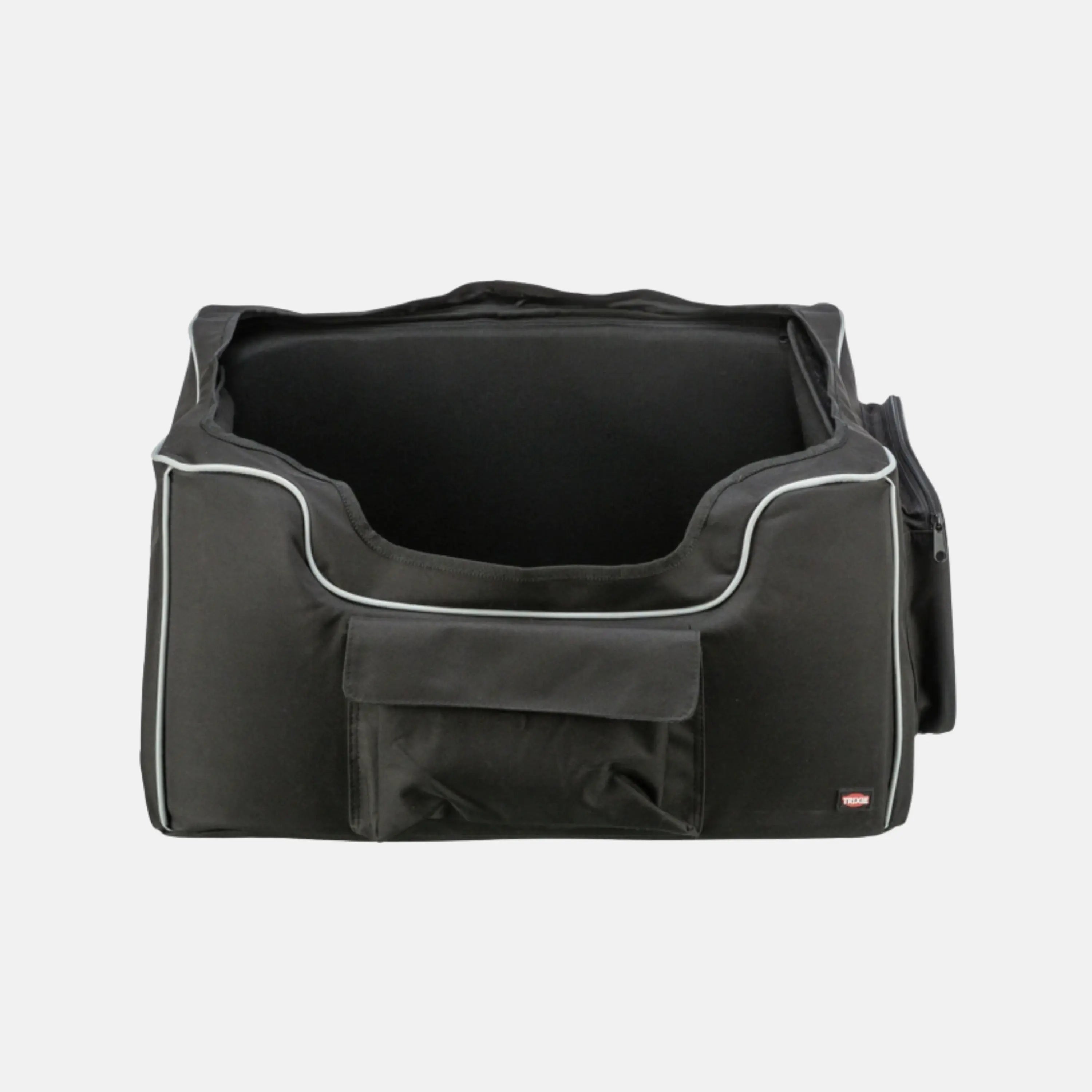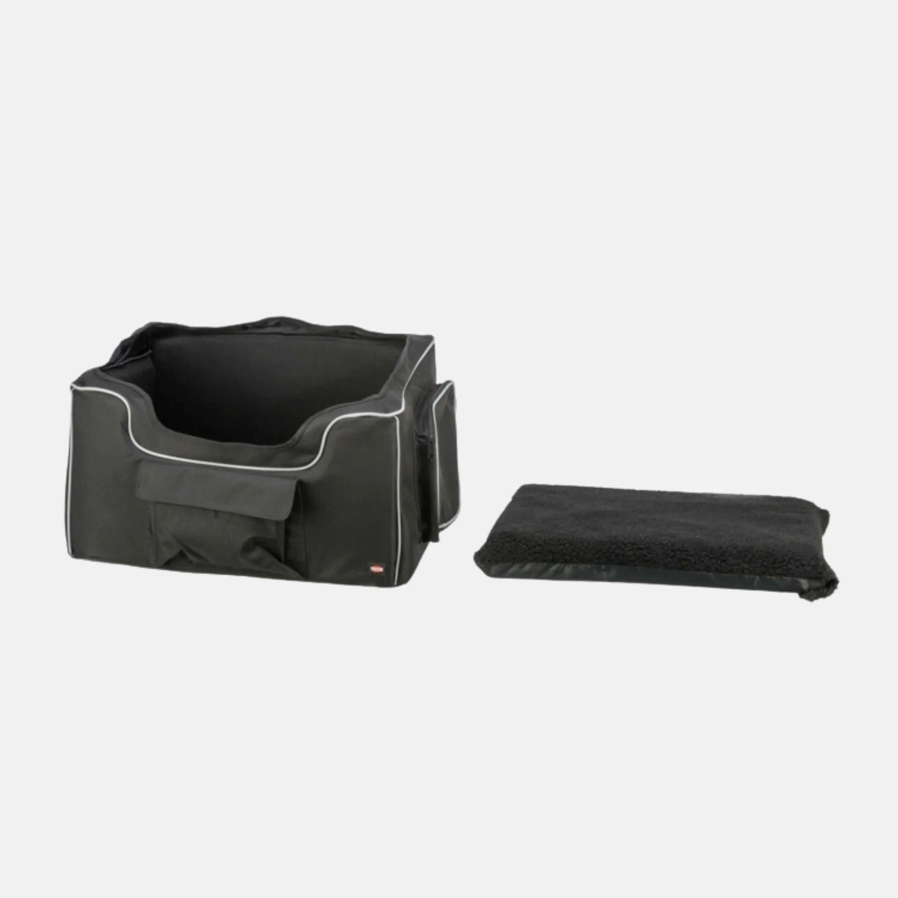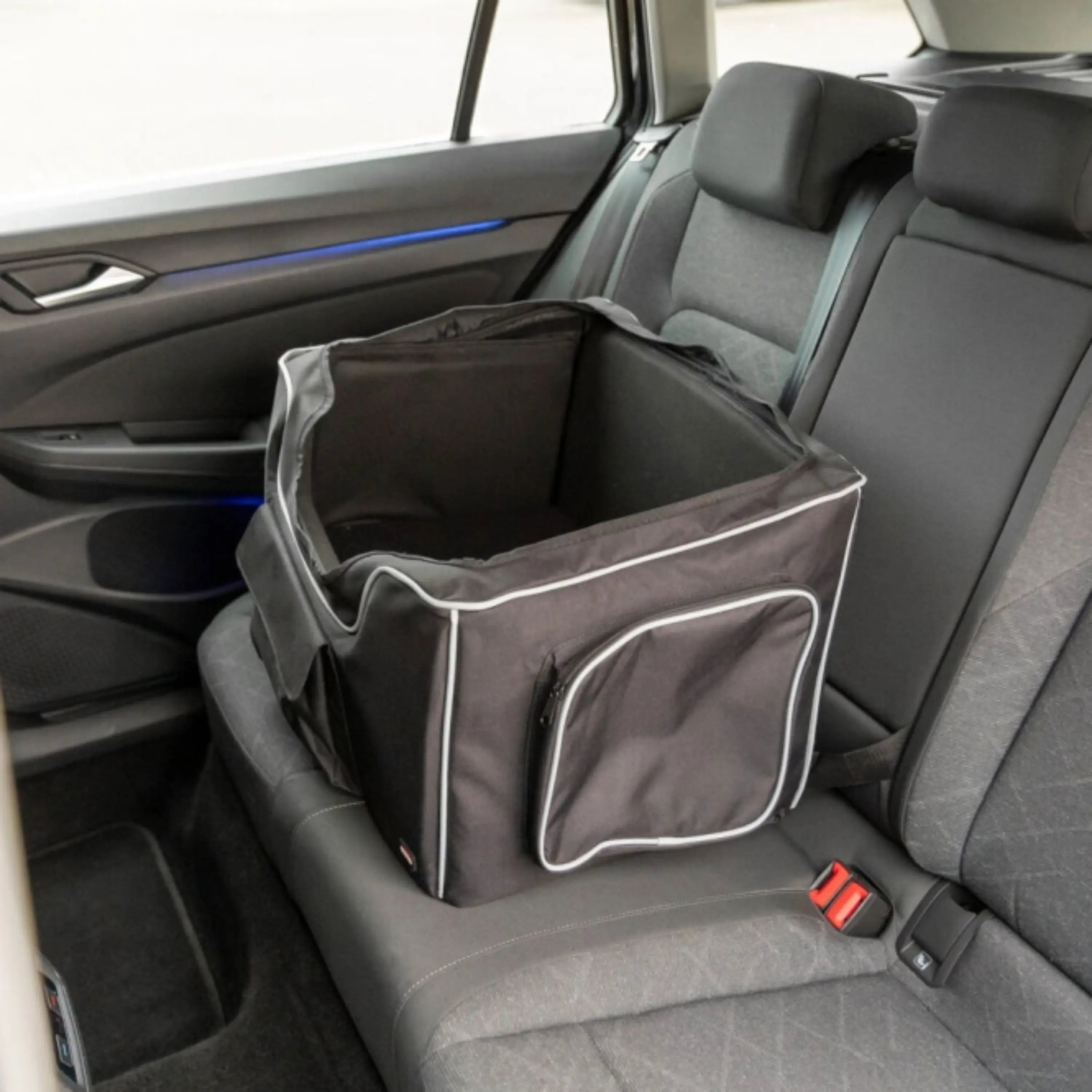 Das Bild zeigt den Trixie Autositz Midi aus der Schrägansicht. Der Autositz ist zusammenklappbar und hat die Maße 56 x 37 x 36 cm.
